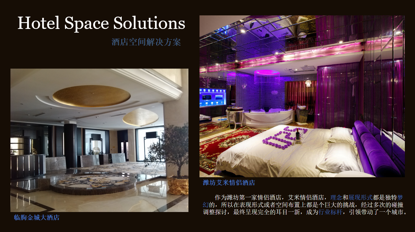 ·山东区域:临朐金城大酒店(四星)、昌城大酒店(四星)、青州凤凰引民宿艺术村、青州 76 所校园电视台 / 录播室、新松机器人展厅、富士康农业展厅、鲁欧智造办公楼、潍坊高新区怡心社区改造等。