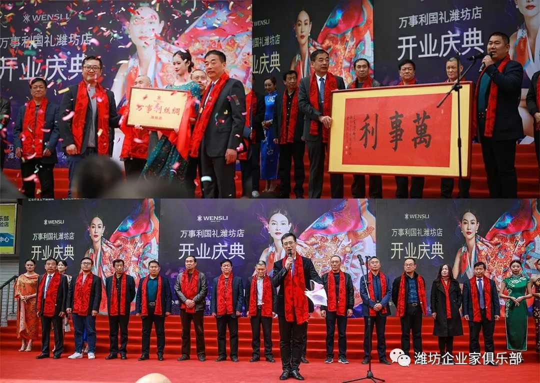 万事利国礼潍坊店由潍坊东方企业家俱乐部常务会长单位——潍坊丰华(集团)公司经营。潍坊东方企业家俱乐部常务会长王超、韩宝晶、李玲及理事会代表参与了开业庆典并赠送了致贺书法。