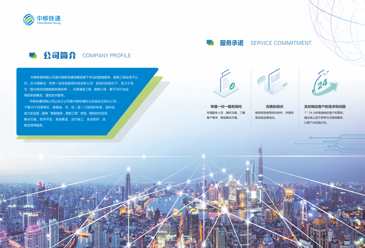 中移铁通有限公司是中国移动通信集团旗下专业从事数智服务、数智工程全资子公司,在中国移动“世界一流信息服务科技创新公司”新定位的指引下,致力于成为“国内领先的数智服务提供商”。主营通信工程、数智工程,基于5G 行业应用的系统集成、通信技术服务。中移铁通有限公司山东分公司是中移铁通在山东省设立的分公司,下辖17 个经营单位,具备省、市、区(县)三级组织体系,面向全省乃至全国,围绕“数智服务,数智工程”领域,提供技术咨询、解决方案,软件开发、系统集成、交付施工、安全防护、运维支撑等服务。